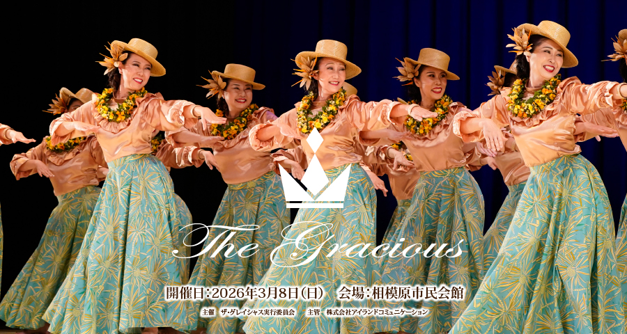 ザ・グレイシャスはフラで輝いているグレイシャスの皆様を対象とした全国大会です。本大会は40歳以上、50歳以上、60歳以上のソロ・グループ計6カテゴリーに分かれて審査され、ソロ・グループ部門ともアウアナのみの競技とします。ザ・グレイシャス2026への皆様のご参加を心よりお待ち申し上げます。